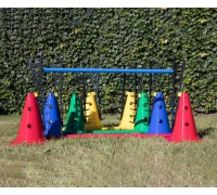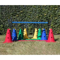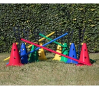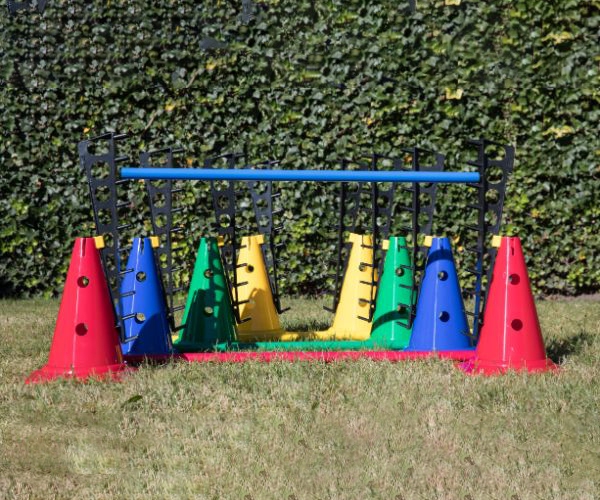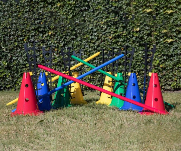 Das Hürdensystem besteht aus zwei Haltern, die einfach auf einen Trainingskegel von 30 cm Höhe gesteckt werden. Die Stangen können auf 10 verschiedene Höhen eingestellt werden.