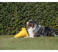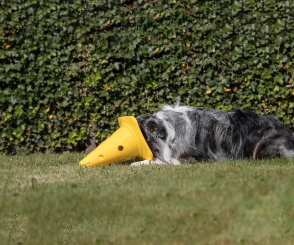 Du kannst die Übungen auch variieren: Lass deinen Hund einmal unter der Stange durchkriechen statt darüber springen oder übe spielerisch, indem du ihn seine Nase in den Kegel stecken lässt.