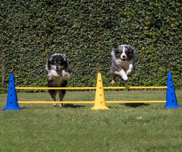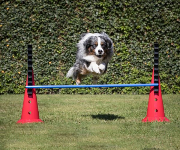 Lass deinen Hund sich langsam an das Springen über die Stange gewöhnen. Erhöhe die Höhe schrittweise und füge das Kommando „Hopp“ erst hinzu, wenn dein Hund das Springen sicher beherrscht.