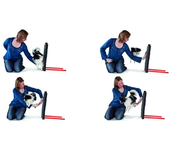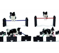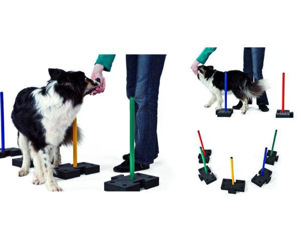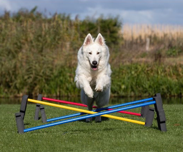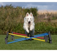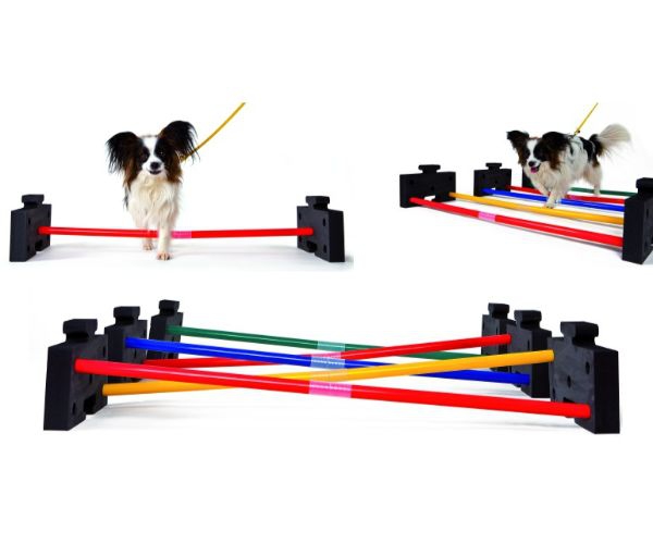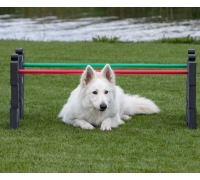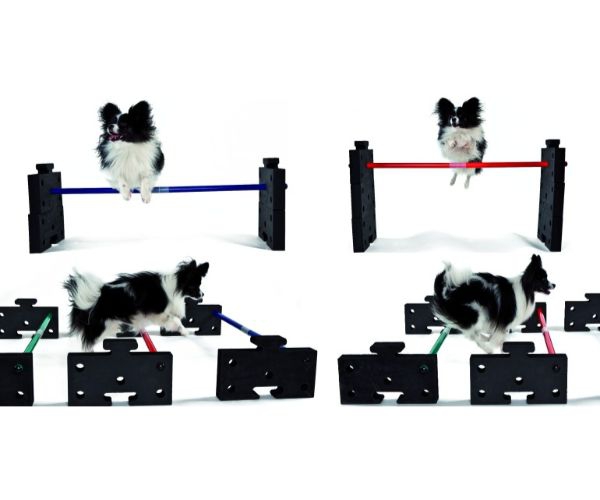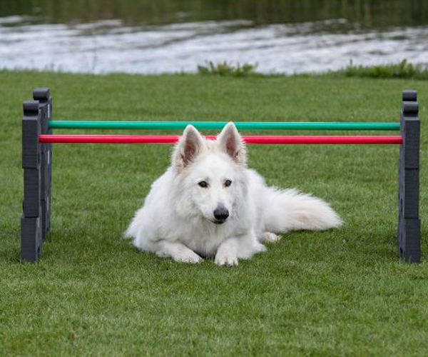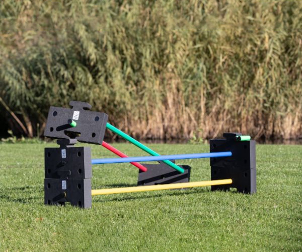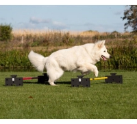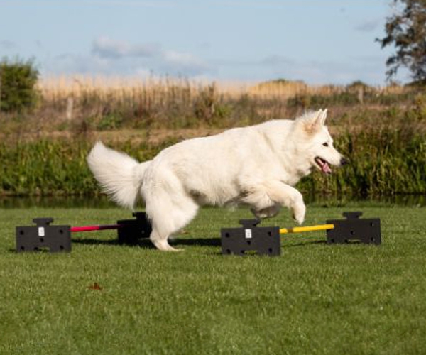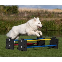 Mit den Seitenteilen und einer Stange lässt sich schnell ein Sprunghindernis aufbauen. Die Seitenteile können gestapelt werden, um eine höhere Sprunghöhe zu erreichen. Zwei Hindernisse können auch als Begrenzung dienen, um dem Hund das gerade Vor- oder Rückwärtslaufen beizubringen.