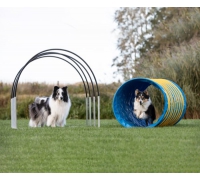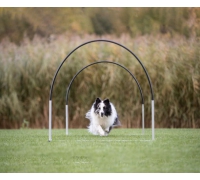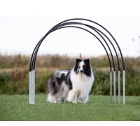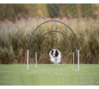 Ein Parcours besteht aus bogenförmigen Hindernissen (Hoops), kurzen Tunneln, Tor- und Fasshindernissen, um die der Hund herumlaufen muss.