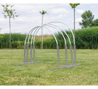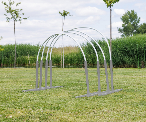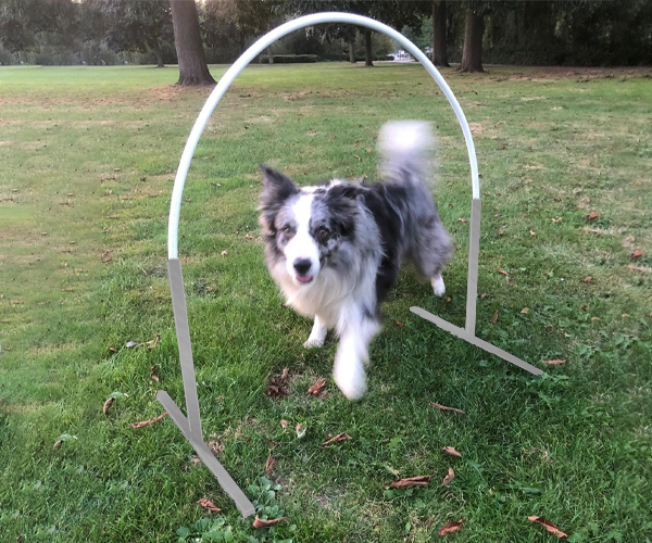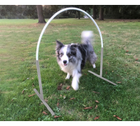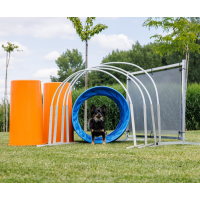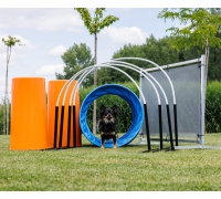 Ein Parcours besteht aus bogenförmigen Hindernissen (Hoops), kurzen Tunneln, Toren und Tonnen, um die der Hund laufen muss.