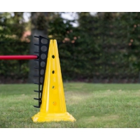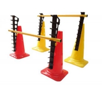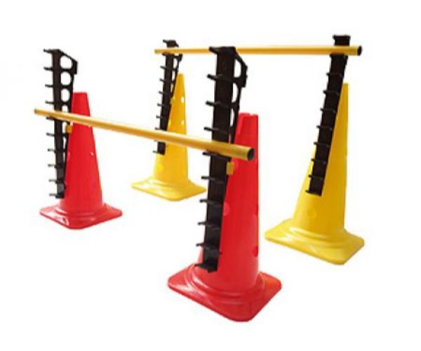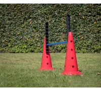 Dieses Hürdensystem besteht aus einem Set mit zwei Halterungen, die auf 30 cm oder 50 cm hohe Trainingskegel gesteckt werden können (Trainingskegel nicht im Lieferumfang enthalten).