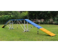 Der Dogwalk besteht aus einem schmalen, erhöhten Laufbalken mit einer Auf- und Abgangsrampe an beiden Seiten.
