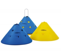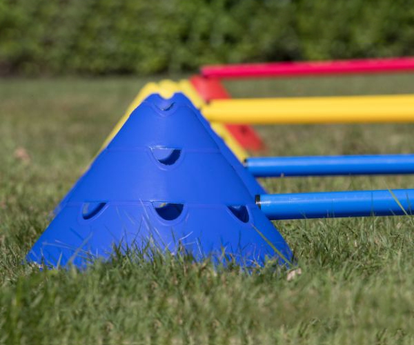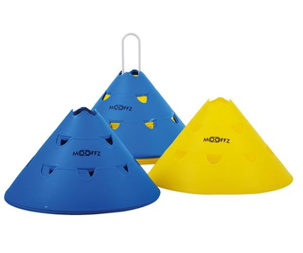 Die Markerungshütchen verfügen über Einkerbungen in verschiedenen Höhen, in die eine Stange gelegt werden kann. So kann auf unterschiedlichen Höhen trainiert werden: auf 5, 10 und 15 cm.