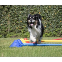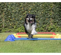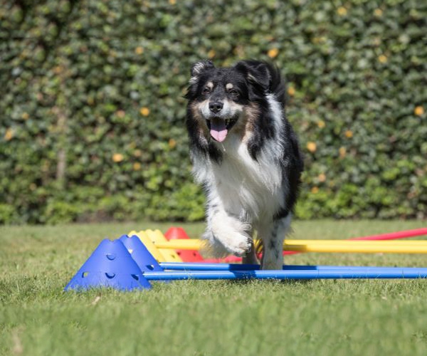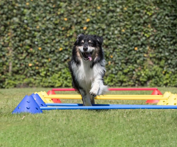 Zwinge deinen Hund niemals zum Springen. Wenn er zögert, spring gemeinsam mit ihm über die Hürde. Achte auf ausreichend Platz für Absprung und Landung und bringe ihm bei, mittig über die Hürde zu springen.