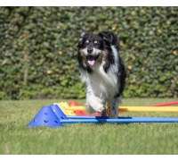 Zwinge deinen Hund niemals. Wenn er zögert, spring gemeinsam mit ihm über die Hürde. Achte auf ausreichend Platz für Absprung und Landung und bringe ihm bei, mittig zu springen.