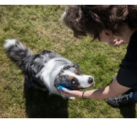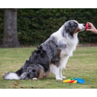 Wenn du die Scheibe in der Hand hältst, achte darauf, dass dein Hund nicht hineinbeißt.