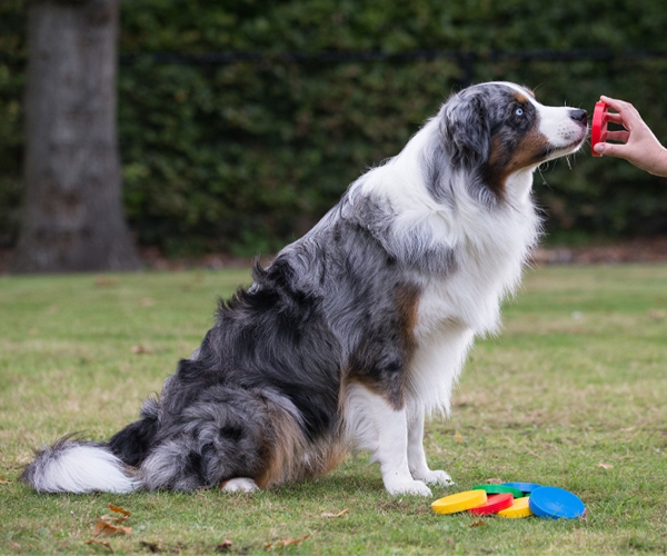 Sobald der Hund die Scheibe mit der Nase berührt, sagst du „Touch“ und belohnst ihn mit einem Leckerli oder Clicker.