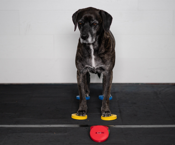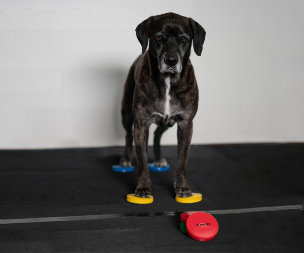 Lass sie mit den Vorderpfoten auf zwei Scheiben stehen, um Balance und Körperbewusstsein zu trainieren.