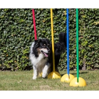 Stelle mehrere Füße mit Stangen in einer Reihe auf und führe deinen Hund abwechselnd „um“ jede Stange, bevor du ihn wieder zu dir rufst.