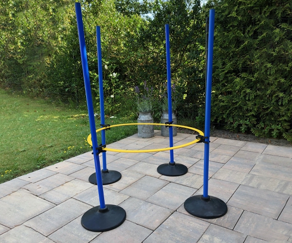 Setze eine Stange in den Gummifuß und bringe deinem Hund bei, linksrum und rechtsrum um die Stange zu laufen.