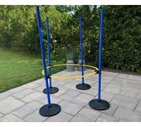 Stelle zwei Gummifüße mit Stangen in einer Reihe auf und lege am Ende den Reifen auf den Boden.