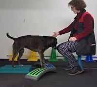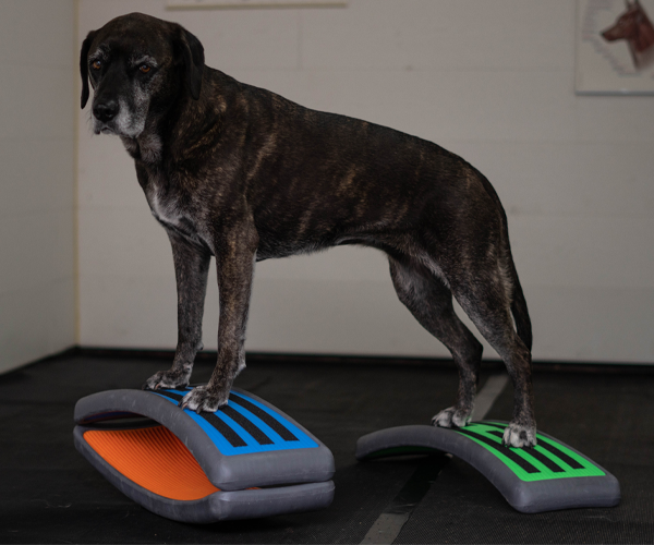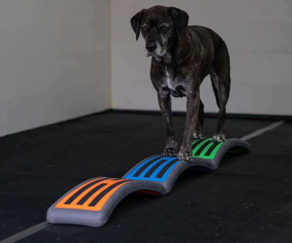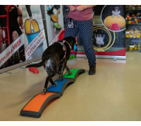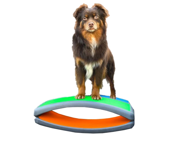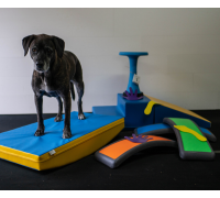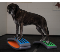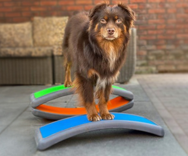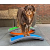 Platzieren Sie zwei Arches mit der hohlen Seite leicht schräg zueinander (Dreiecksform) und ein Balance Pad dahinter. Lassen Sie den Hund mit den Vorderpfoten von einer Arch zur anderen wechseln, während die Hinterpfoten auf dem Pad bleiben.