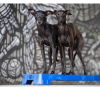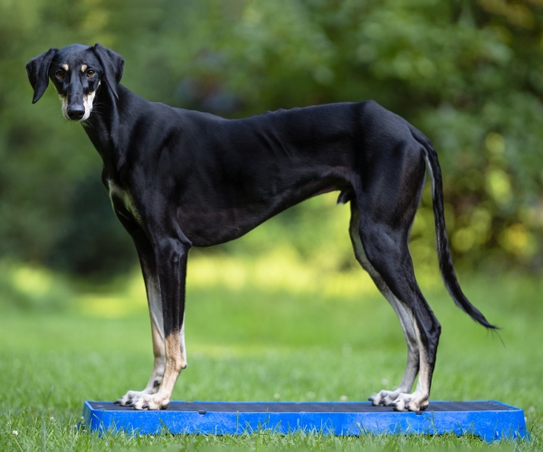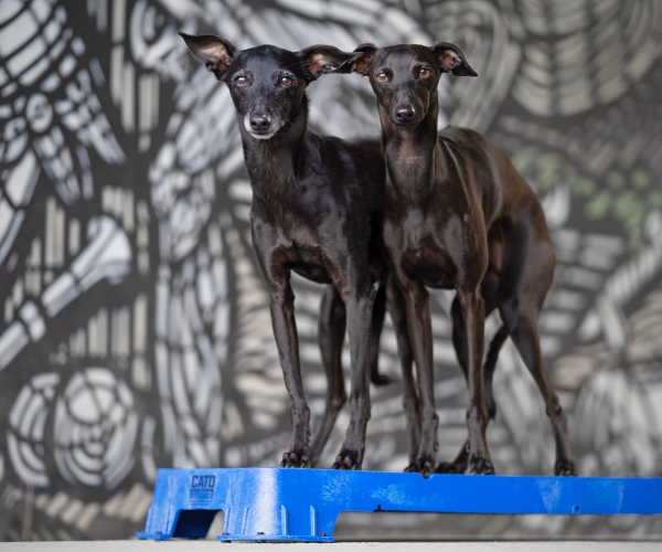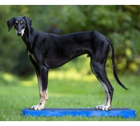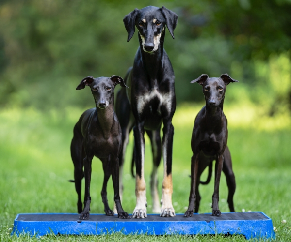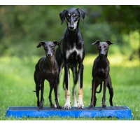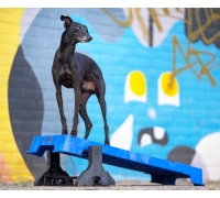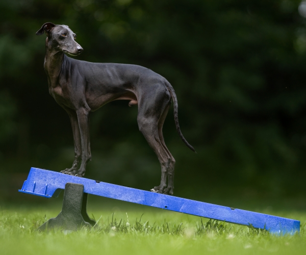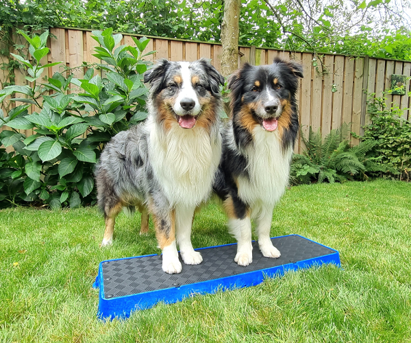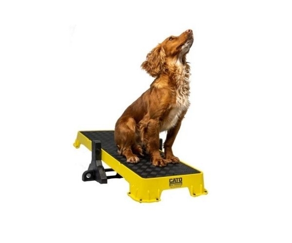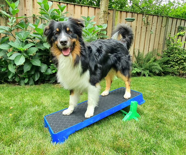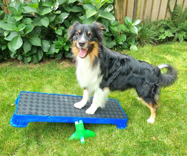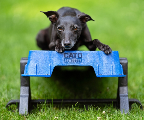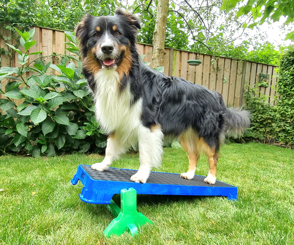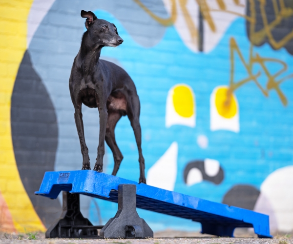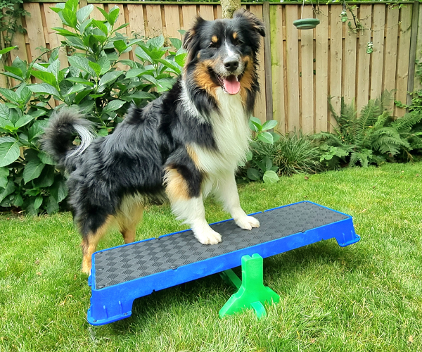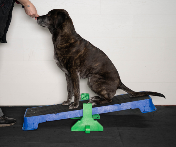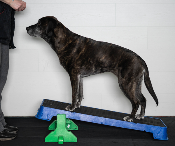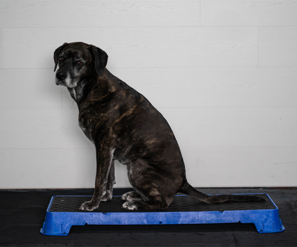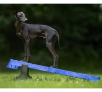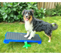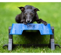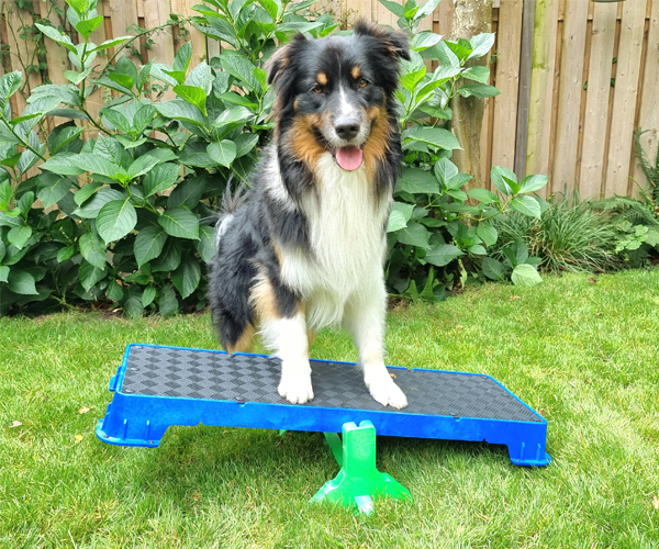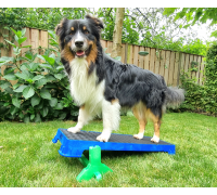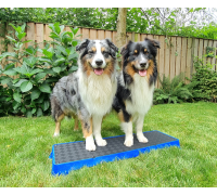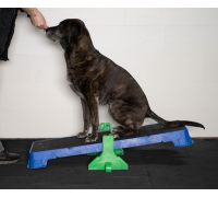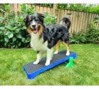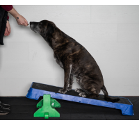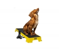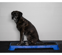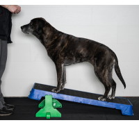 Wenn Sie die Plattform auf der höchsten schrägen Seite verwenden, lassen Sie den Hund nicht zu weit vorne sitzen. Die Plattform kann kurz nach vorne kippen, was den Hund erschrecken könnte.