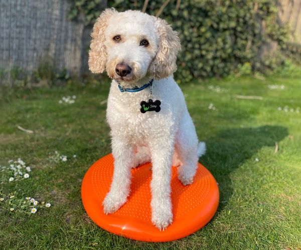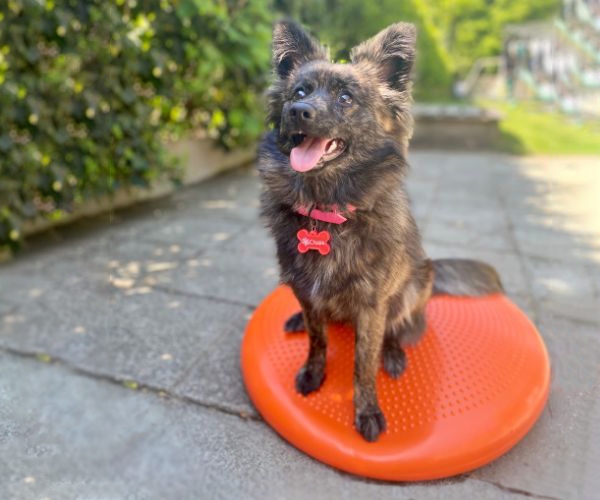Hunde können lernen, auf dem Balance-Kissen zu sitzen und zu stehen.