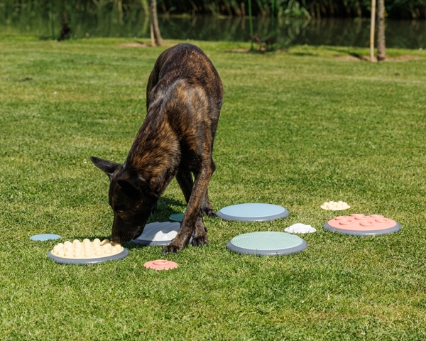 Um die Sinne deines Hundes zusätzlich zu stimulieren, kannst du das 5-teilige oder 10-teilige Set Tastscheiben in deinen Schnüffelgarten integrieren. Für den Trainingsaufbau platzierst du die Scheiben zunächst weiter auseinander und legst sie danach Schritt für Schritt näher zusammen, mit Leckerlis dazwischen, sodass dein Hund – wenn er möchte – immer mehr darüber laufen kann.