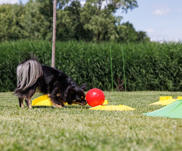 Für zusätzlichen Spielspaß kann Doggy-Golf auch als Wettbewerb gespielt werden. Zwei Hunde und ihre Halter treten auf getrennten Parcours gegeneinander an – wer zuerst alle Hindernisse meistert, gewinnt!