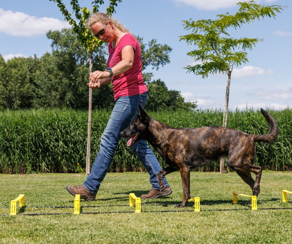 Lass deinen Hund rückwärts über die Leiter laufen, sodass er bewusst zwischen die Sprossen tritt.
