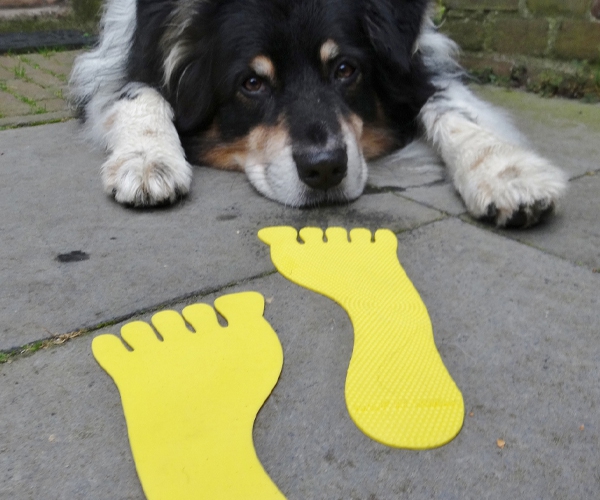 - Lege die Füße zu Beginn des Trainings an die Plätze, an denen du deine Teilnehmer stehen haben möchtest. Jeder bekommt ein eigenes Paar – so ist das Feld geordnet und du vermeidest Unruhe, besonders bei reaktiven Hunden.