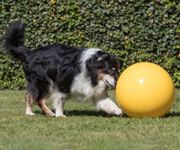 Hunde mit einer Schulterhöhe bis 40 cm verwenden beim Treibball einen Ball mit 45 cm Durchmesser.